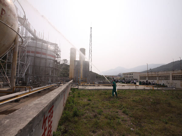 15:30分,隨著生產(chǎn)部報(bào)警聲響起,LNG灌區(qū)發(fā)生泄漏,現(xiàn)場(chǎng)指揮接警后立即按響報(bào)警器,指揮相關(guān)小組啟動(dòng)消防水泵,對(duì)灌區(qū)進(jìn)行緊急噴淋,隔離相鄰儲(chǔ)罐,并組織員工按預(yù)定區(qū)域到達(dá)避難位置。市消防派出2輛高噴消防車、6輛水罐消防車到達(dá)起火現(xiàn)場(chǎng),火情偵檢組隨即展開偵檢,先用泄露儀對(duì)現(xiàn)場(chǎng)進(jìn)行濃度檢測(cè),并用隔離帶劃出相應(yīng)的警戒線,保安配合警戒組疏散區(qū)域內(nèi)無關(guān)人員及在場(chǎng)使用中的車輛熄火,同時(shí)關(guān)閉大門,禁止除消防車、搶險(xiǎn)車外的一切車輛出入。在得知了著火位置和泄漏程度后,中隊(duì)指揮員立即下令,展開滅火行動(dòng)。消防隊(duì)員穿上消防戰(zhàn)斗服、佩戴防毒面具和呼吸器、攜帶銅質(zhì)工具和滅火器材迅速趕往事故儲(chǔ)罐,關(guān)閉儲(chǔ)罐根部所有閥門。而其余消防車按照預(yù)期指定位置,全方位對(duì)LNG灌體進(jìn)行火災(zāi)撲救。